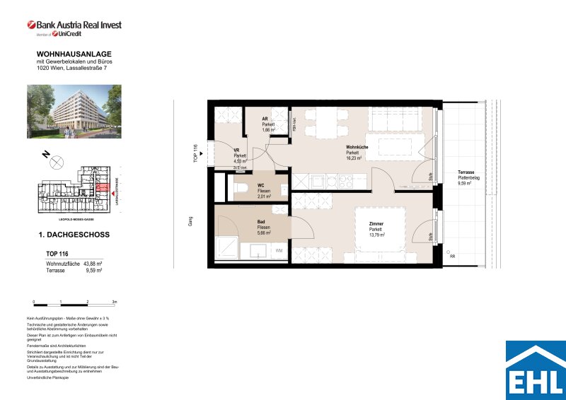 Fernwärme mittels Fußbodenheizung Fußbodenkühlung moderne Eichenparkettböden in den Wohnräumen vollausgestattete Einbauküchen mit Miele Geräten hochwertiges Feinsteinzeug in den Nassräumen außenliegender Sonnenschutz mittels Raffstores in jedem Raum hochqualitative LAUFEN Produkte in den Sanitärräumen Waschmaschinenanschlüsse in jeder Wohnung hörerlose Audio/Video-GegensprechanlagenDas Objekt verfügt über 2 Aufzüge, einen Kinderwagenraum, sowie einen Fahrradabstellraum.